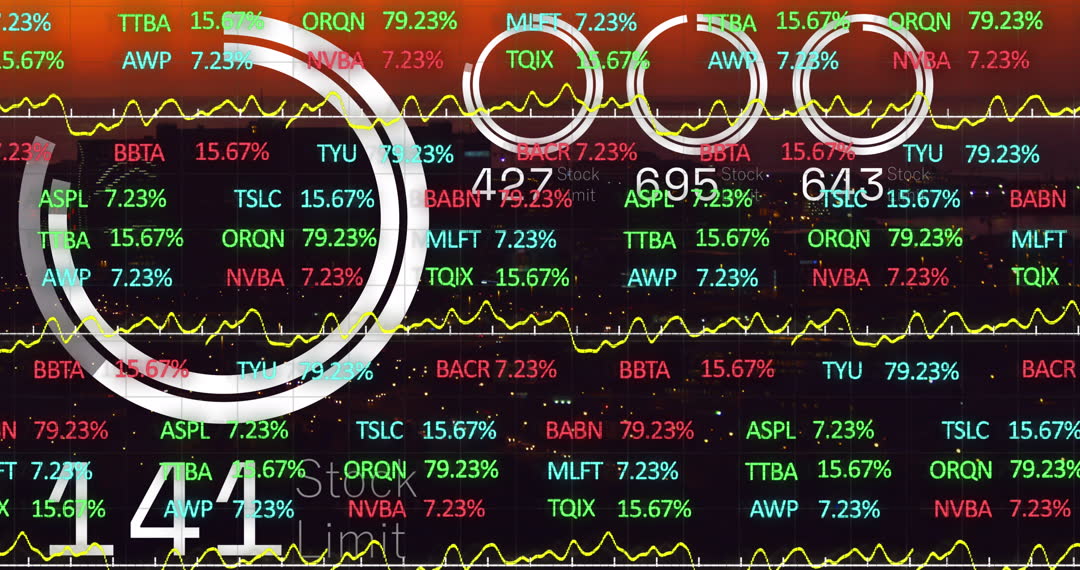 Illustration features an animated display of stock market numbers with technical data overlays, providing a futuristic view of global finance and investment strategies. Useful for presentations related to financial markets, economic forecasts, and digital technology analytics.