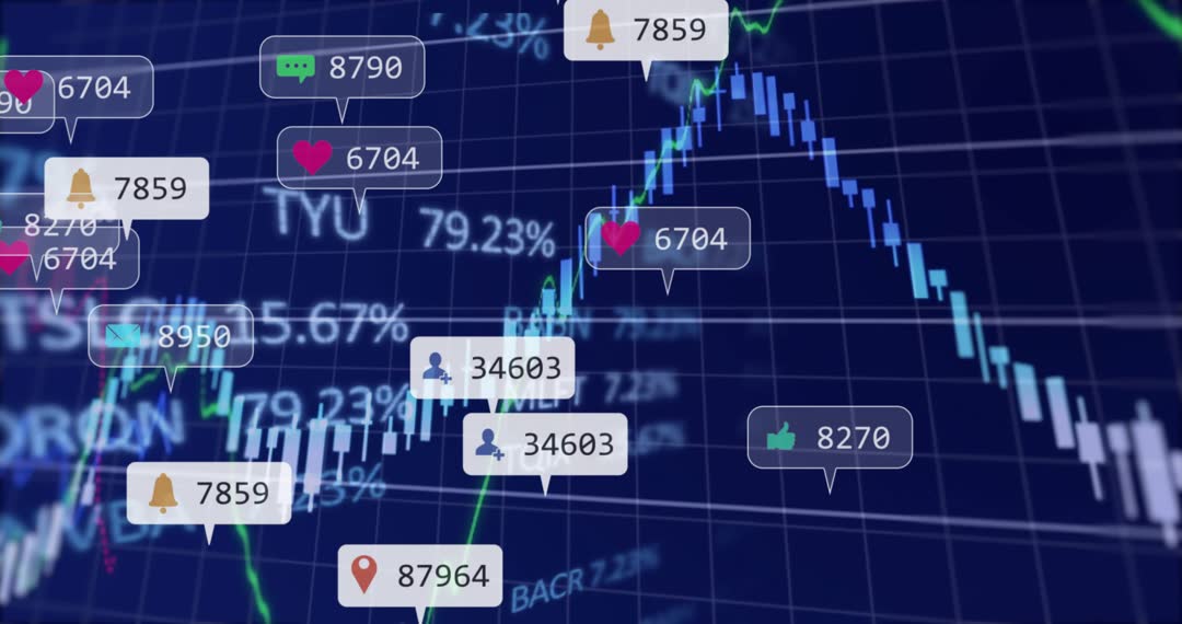 This digital stock market scene features a trading chart with candlestick bars and trend lines on a blue screen, illustrating dynamics of finance trends. Integrated is a multitude of engagement icons including mentions, alerts, likes, aiding detailed data analysis in modern finance software. Excellent for articles on developing economic predictions, modern trading platforms advancement, educational content on technology in finance domains or as a background in finance-related presentations or apps.