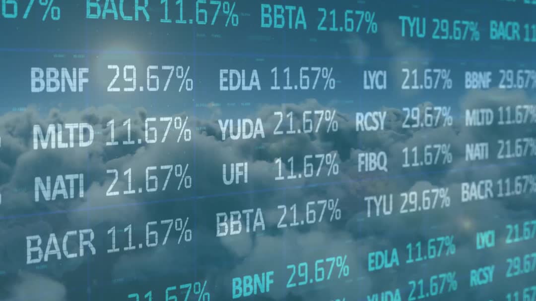 Blurred close-up view of dynamic figures and percentages on cloud backdrop illustrating stock market metrics. This digital depiction is perfect for use in financial reports, market analysis presentations, or technology showcases. Emphasizes the synergy between modern data visualization and finance driven world infantilizing technology context.