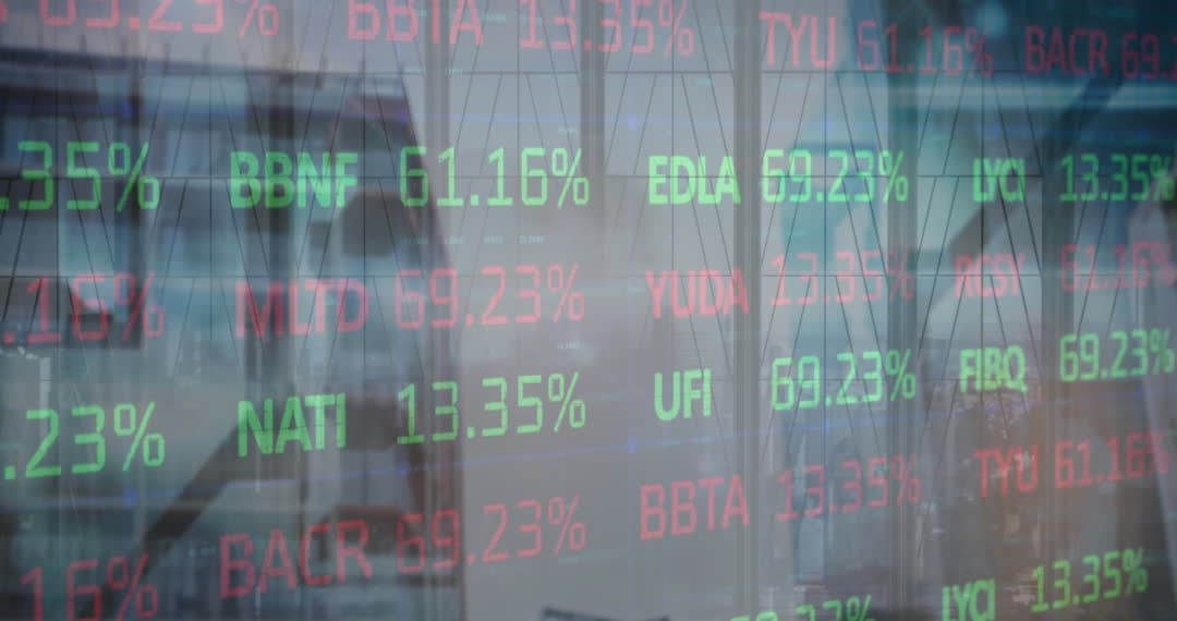 Image features digital stock market data overlay with green and red numbers against an urban backdrop, suggesting globalization, finance, and business technology integration. Useful for topics on economic analysis, digital banking transformation, global trades, investment strategies, corporate presentations, and economic forecasts.