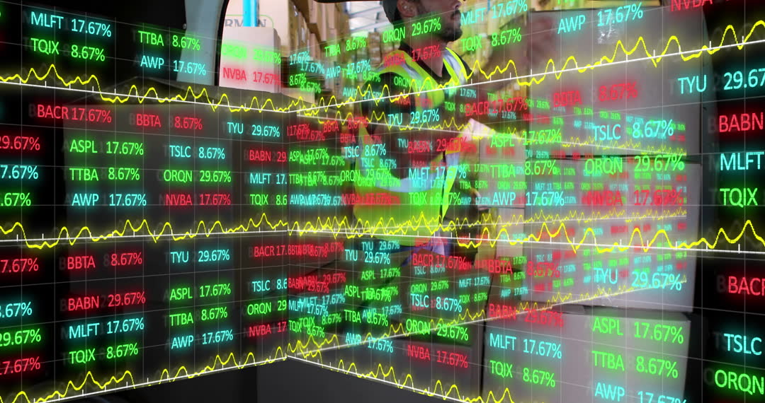 - Digital Stock Market Data Overlaying Warehouse Logistics