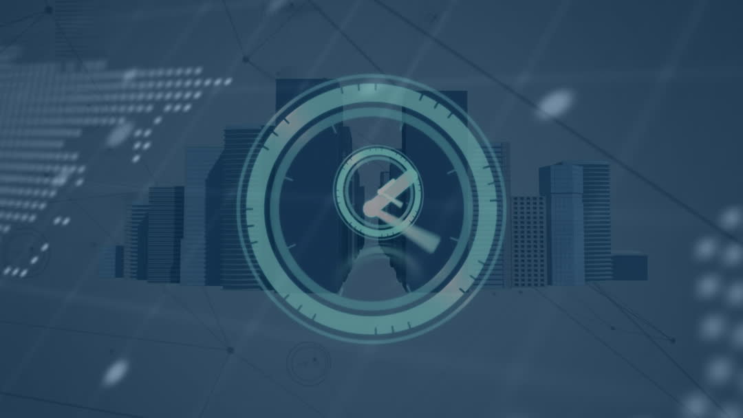 Digital theme shows a clock overlaying a cityscape with abstract data visualization elements. Ideal for content about future technology, data systems, time management software or digital city infrastructure. Suitable for backgrounds or illustrations in tech presentations and digital interfaces.