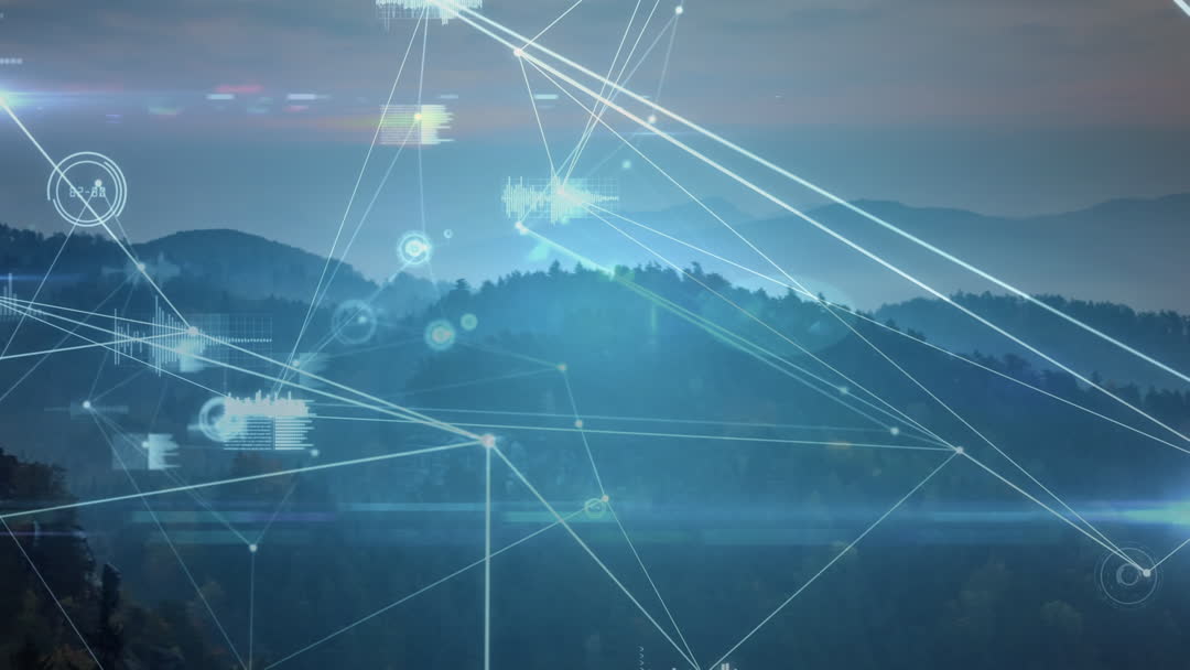 Abstract animation featuring digital network connections superimposed over a tranquil mountain landscape, conveying a sense of global connectivity and advanced technology. Suitable for use in projects focusing on digital transformation, computer networks, and nature-centric technology conceptual designs.