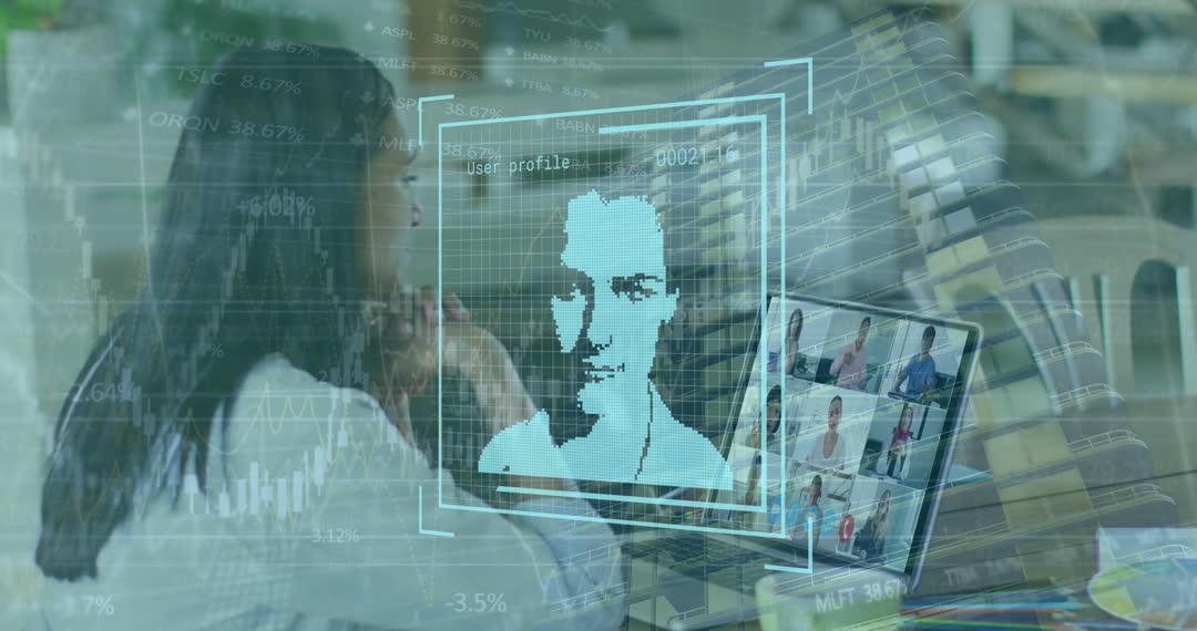Biracial woman engaging in a video call on her laptop, overlaid with digital abstract graphics such as a user profile and charts. The concept highlights modern virtual communication and digital technology in the context of global business and connectivity. This visual is ideal for tech-focused presentations, business seminar infographics, or articles on digital transformation.