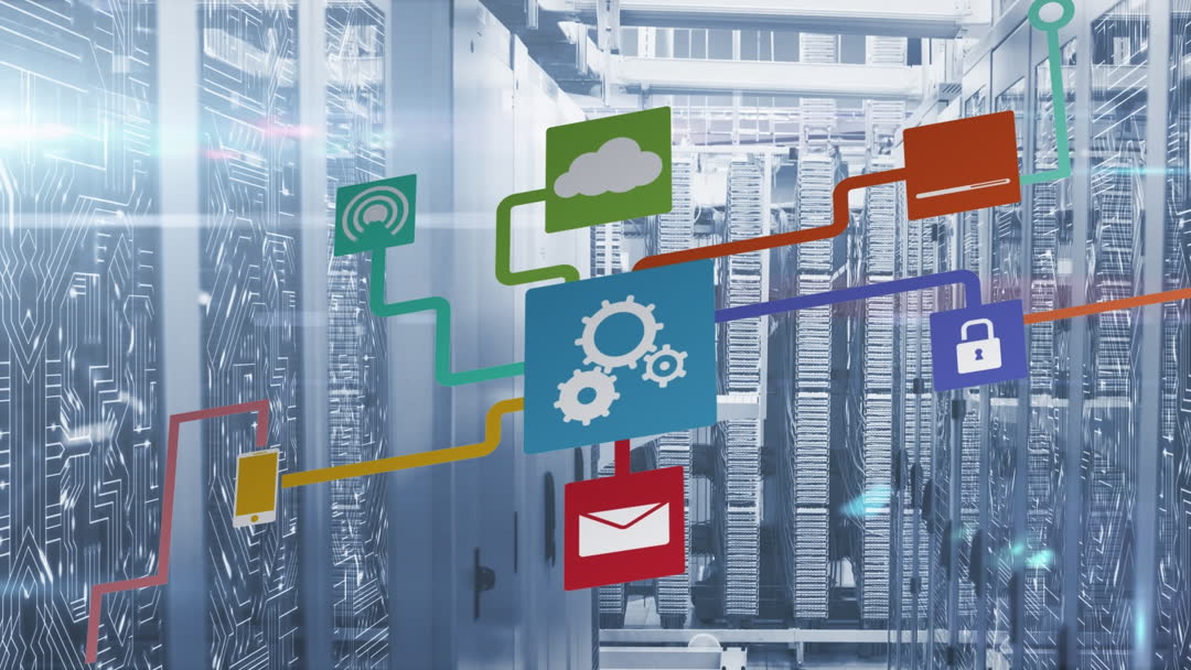This visually engaging composition features vibrant technology icons overlaying the intricate design of a server room, symbolizing modern digital solutions. The intertwining icons suggest notions of connectivity, storage, and data management. This content is ideal for illustrating concepts related to digital transformation, modern tech infrastructure, cloud services, and cybersecurity strategies in contexts like website banners, tech blogs, or educational materials.