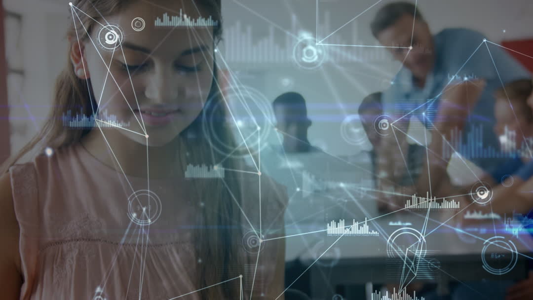 Students collaborating in a classroom environment with digital network overlays representing technology integration in learning. Great for illustrating modern educational methods, technological advancement in classrooms, or promotional content for educational technology companies.