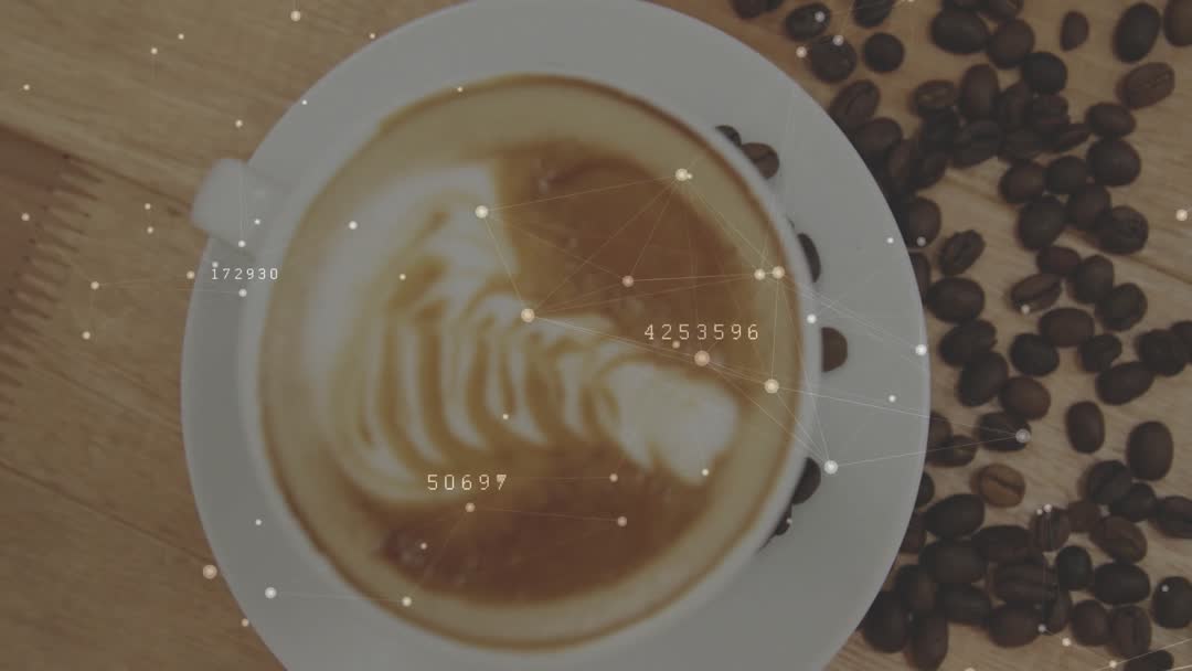 The network overlay on the steaming cup of latte conveys a fascinating blend of coziness and modern digital technology. Perfect for illustrating articles or advertisements focused on technological advancements in the coffee industry. Ideal for design projects showcasing digital transformation in cafes or hospitality, tourism, and food service technology.