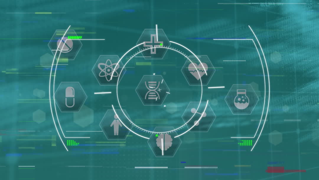 Visualization featuring futuristic HUD diagrams with medical and scientific icons on digital interface. Ideal for presentations on technology advancements, digital interfaces, or scientific innovation. Useful for illustrating modern network systems or software development environments.