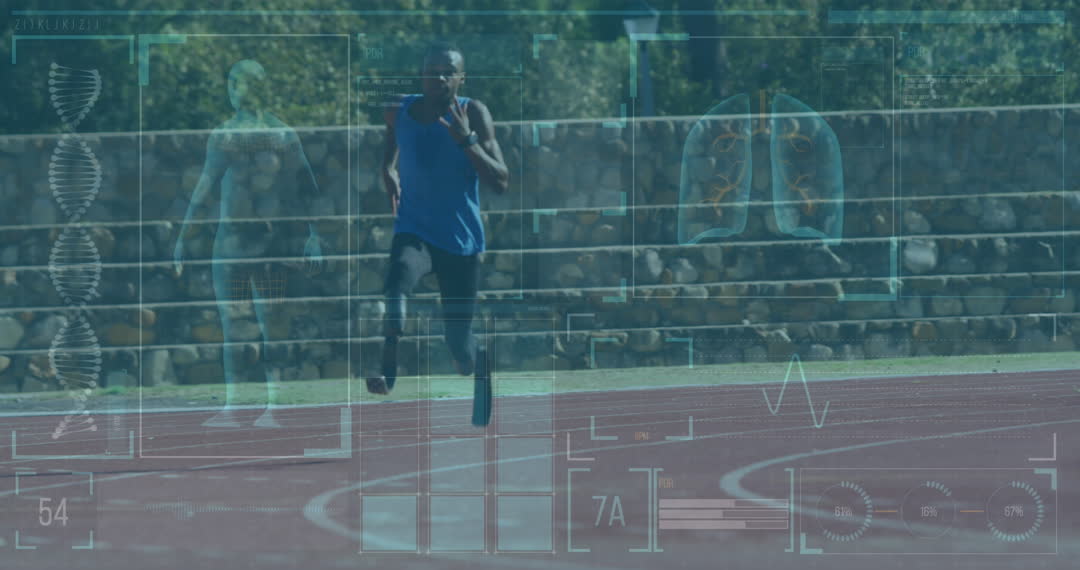 This shows an African American athlete using a running blade with an augmented reality screen providing digital data on performance metrics. Ideal for materials on advanced sports technology, athlete training programs, or innovations in disabled athletes' accommodations. Can be used in publications about the integration of data analytics in sports, improving training methods and measuring athletic performance.