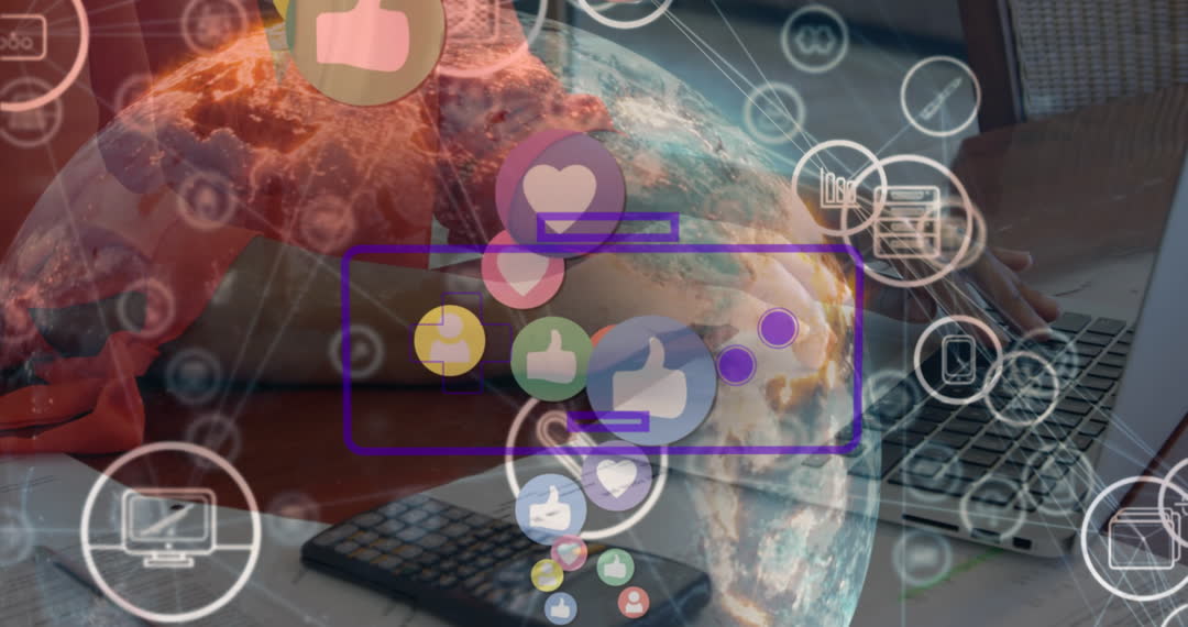 The video blends a digital interface of technology icons with a business workspace, illustrating themes of modern digital connectivity and global communication. The busy desk setup with a person working on a laptop signifies multi-tasking in a tech-driven environment. This concept can be valuable for topics in digital marketing, IT solutions, or remote work platforms and serves as a visualization of integrating technology into everyday business practices.