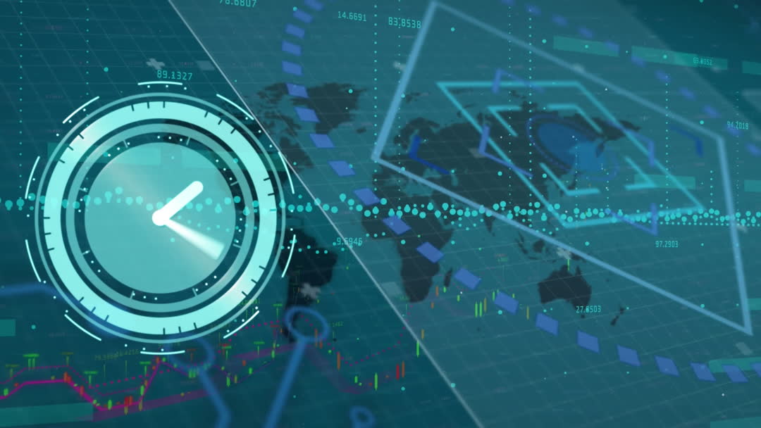 Animation depicts digital overlays of timekeeping and global connections with a focus on data processing. Clock symbol and dynamic graphs emphasize technological innovation. Ideal for use in projects related to technological advancements, digitalisation, global connectivity or time management.