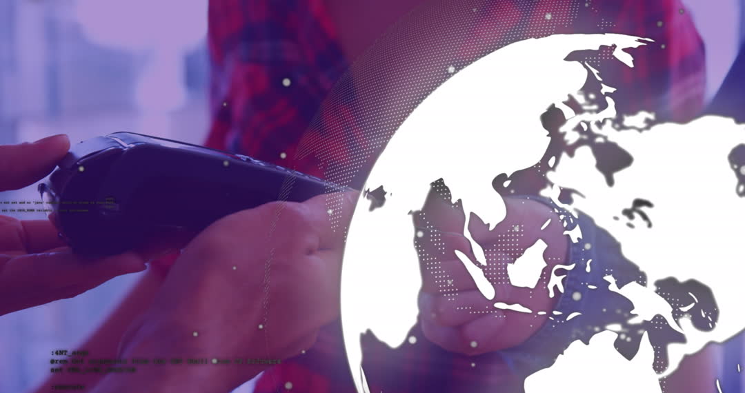 This visual depicts a digital transaction illuminated by an abstract overlay featuring a globe, symbolizing the intricacies of global finance and technology. The integration of card payment videory reflects cashless payment trends. Ideal for use in contexts like financial technology advertising, articles on global commerce, or retail business presentations, it highlights the immediacy of modern transaction methods and international economic connections.