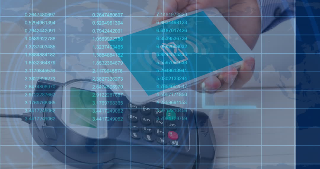 Overlay of data processing and financial icons enhances the theme of digital transactions and mobile payments. Depiction of advanced digital technologies and business interfaces suggests use in contexts like tech innovation articles, fintech blogs, educational resources about electronic payment systems, digital wallets, or cryptographic transactions.