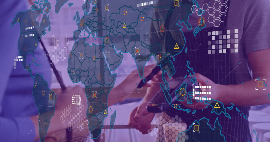 This visual illustrates the fusion of digital technology and global finance, featuring diverse individuals paying via smartphone against a dynamic map and data graphics. Ideal for content about fintech innovations, electronic payments, or articles explaining global financial technology trends. Could also be used in educational materials about technology's impact on retail.