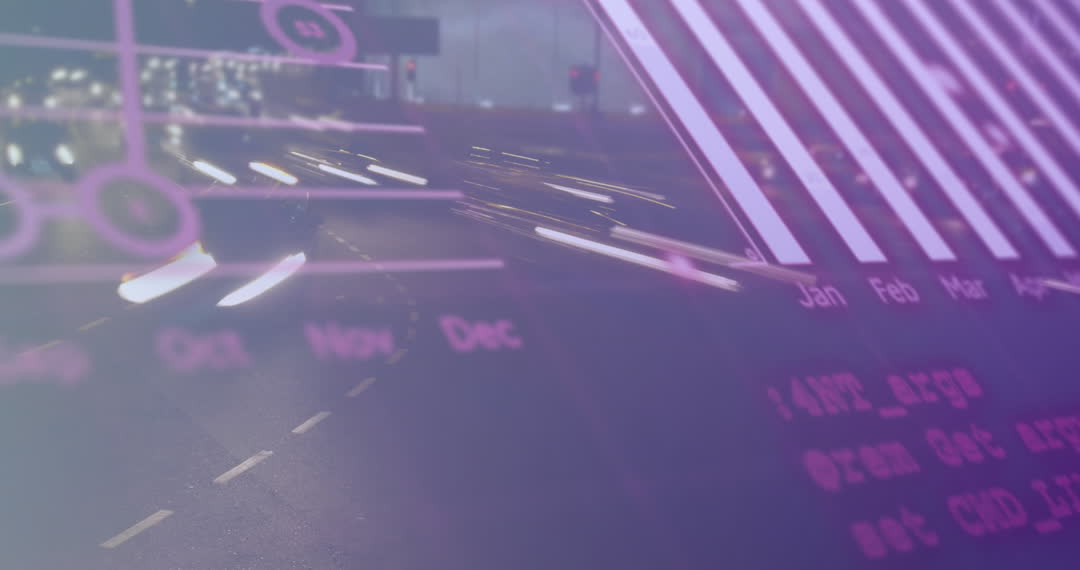 This composition illustrates the intersection of technology and urban transportation. Overlaid digital elements like graphs and coding represent data analysis in a modern business context, making it ideal for presentations on digital transformation, smart cities, or technological advancements in transportation infrastructure. Great for illustrating concepts of globalization and efficiency through technology.