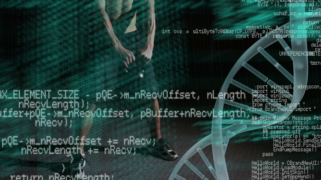 The video portrays intersection of genetic science and fitness. Conceptual merging of fitness activity and data arms characters suggests role of technology in personal health management. Useful for illustrating bioinformatics, modern biomechanical studies, and sports science research, emphasizing interconnectedness of DNA analysis, technology, and athletic progress.