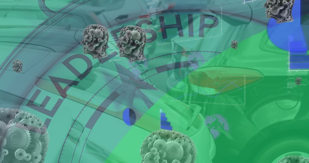 Digital animation featuring speedometer and word 'leadership' overlay with cars symbolizes the fusion of technology and business leadership in the automotive industry. Gears represent machinery and innovation. Suitable for use in business presentations, automotive industry reports, technology innovation discussions, and leadership development materials.
