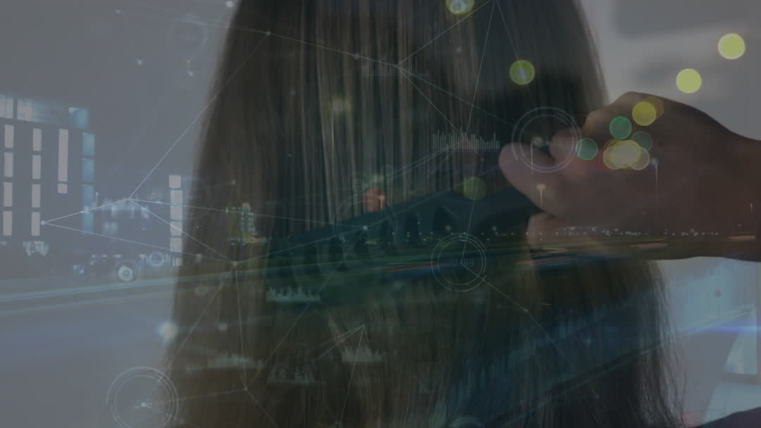 This video creatively symbolizes the intersection of digital technology with the beauty and finance industries, depicting financial data processing overlayed on a woman brushing her hair. The scenery suggests innovation and global connectivity. Suitable for use in articles or websites discussing advancements in technology and their implications in beauty services, or financial growth trends in lifestyle industries.