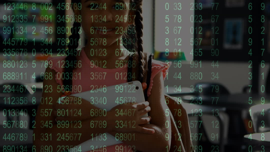 A young African American student standing in a classroom holding a digital tablet, while digital numbers overlay the scene, symbolizing technological integration in education. Ideal for use in articles or promotional materials focused on advanced technology in learning environments, educational digital tools, or innovations in STEM education.