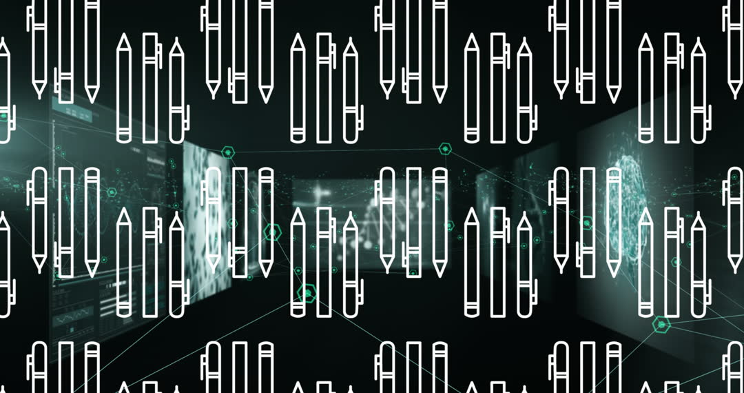 Digitally generated pens overlaying dynamic data network design represent fusion of traditional education tools with modern digital systems. Useful for illustrating concepts of digital education transformations, technology in schools, and generalized institutional advancements. Suitable for educational blog themes, tech innovation presentations, and e-learning platforms.