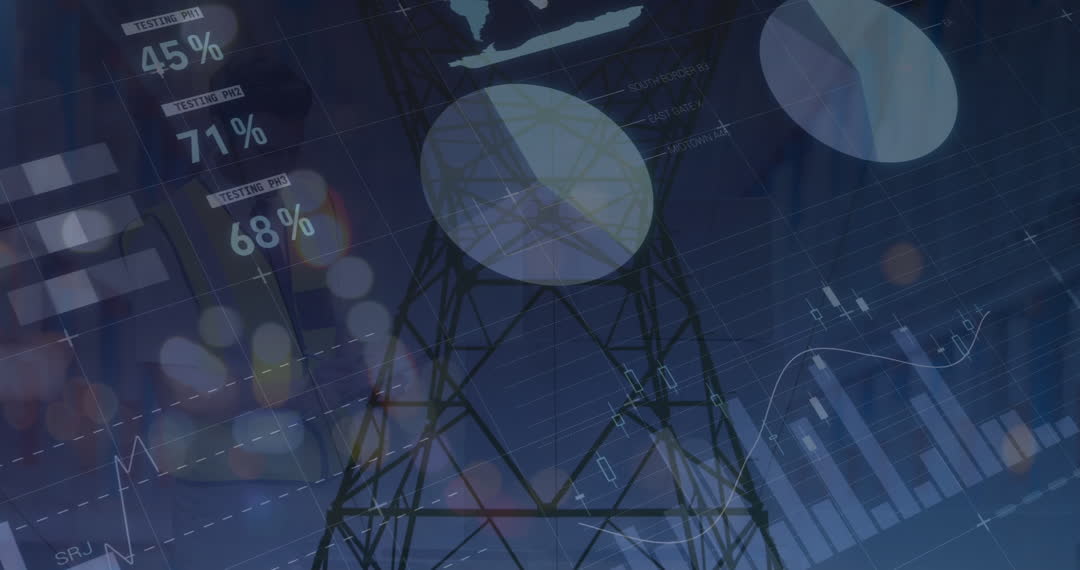 This graphic illustrates digital transformation within the energy sector, focusing on the intersection of technology and data analytics with utility infrastructures like pylons. Ideal for presentations on technological advancements, energy data management, global business trends, and smart grid innovations.