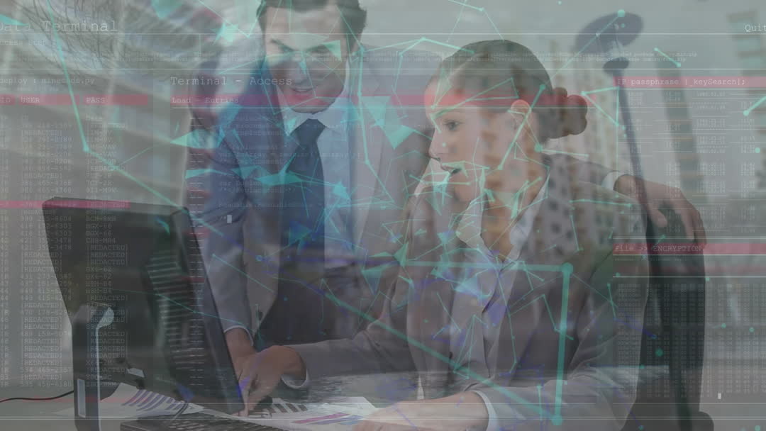 Business professionals collaborating in an office setting, integrated with digital graphics showcasing network connections and data processing. The visual emphasizes technological advancements and global networking in modern business environments. Useful for corporate presentations, technology seminars, or articles focusing on digital transformation and innovation in workplaces.