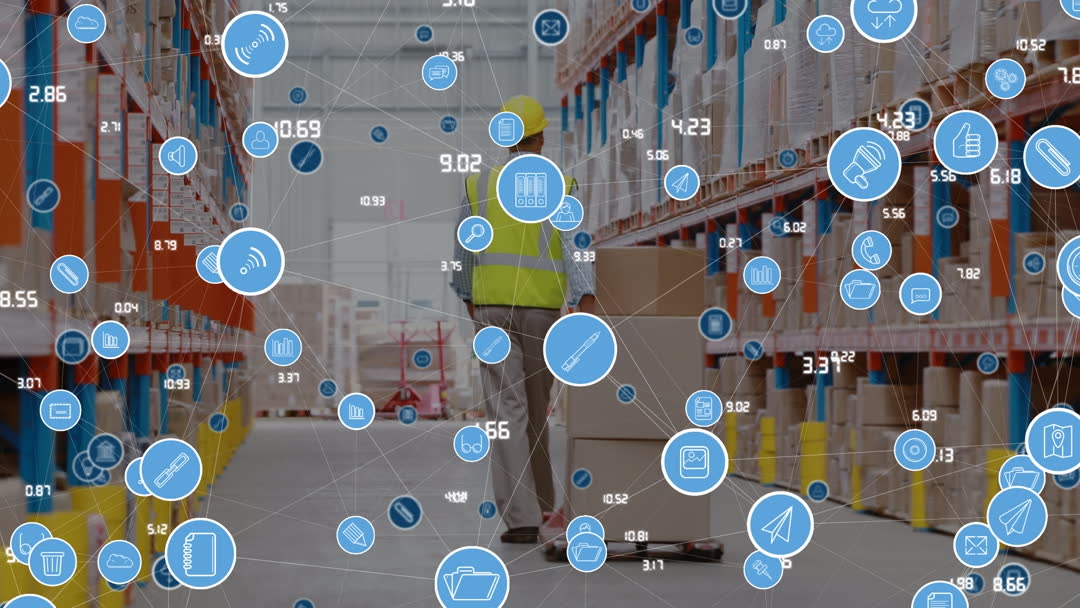Digital Transformation in Warehousing with Media Icons Overlay Video