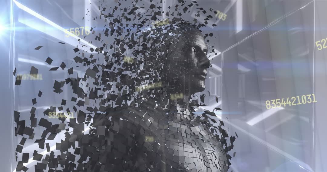 Depicts a digital animation showcasing a human figure dissolving into numerical particles, set against a visually striking neon tunnel. Illustrates themes of digitalization, data transformation, and technological evolution. Perfect for use in projects related to artificial intelligence, the future of technology, digital networking themes, or sci-fi design concepts.
