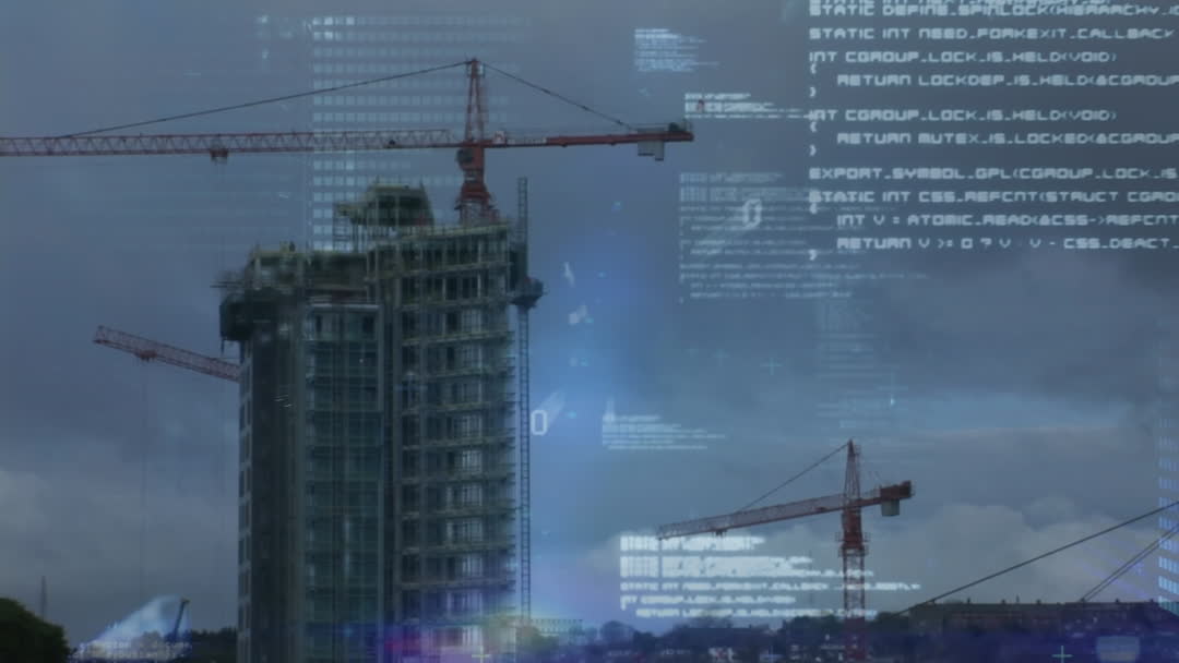 Digital elements overlay a construction site in a visual representation of modern urban development interconnected with technology. Ideal for use in technology-focused presentations, urban planning discussions, and educational materials on the intersection of physical building projects and digital advancements.