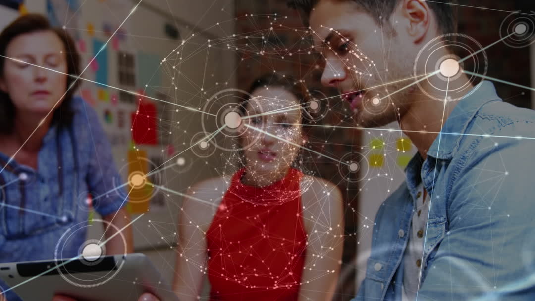 Professionals focusing on a project with holographic network interface overlay. Represents innovation and collaboration in a digital environment. Suitable for materials on teamwork in tech, digital transformations, or abstract concepts of connectivity.