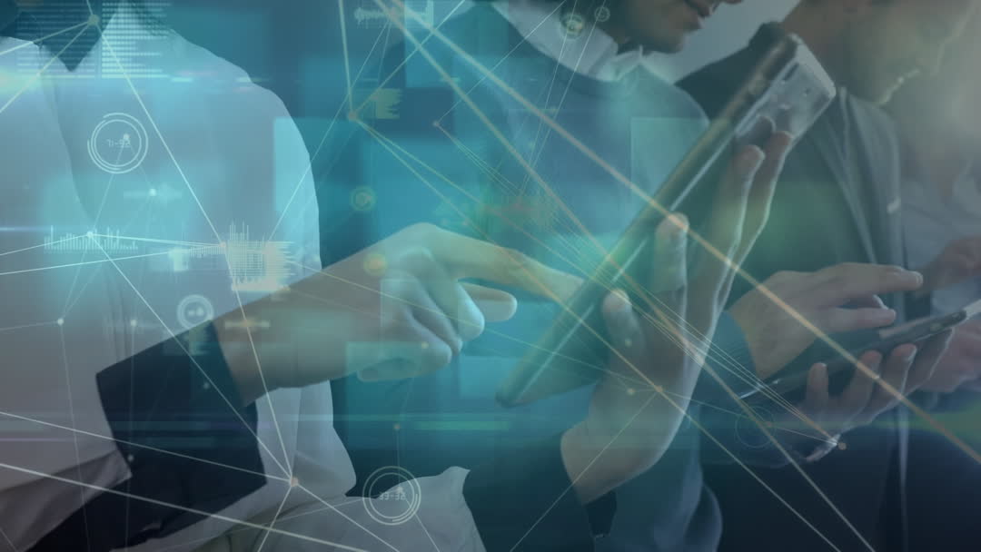 Three business professionals are using digital devices to analyze and process data. The overlay of network connections illustrates the concept of digital transformation and connectivity in a modern office. This video is effective for illustrating themes of innovation, business technology, and teamwork, suitable for use in presentations about digital solutions in business or technology-related content.