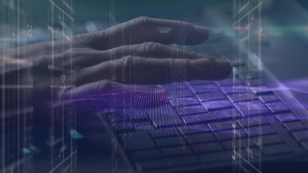 This abstract video portrays the process of digital transformation with an emphasis on technology and coding. A hand interacting with a keyboard is overlaid with data and code elements, signifying integration in the digital space. Ideal for illustrating concepts of programming, cybersecurity, IT advancements, and modern technological innovations.