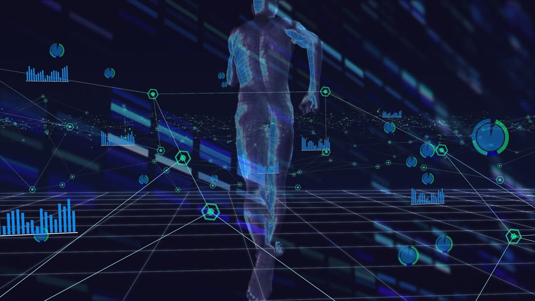 The visual displays a series of digital graphs and networks conforming over an animated model of a running man. The overlay of data points signifies collaboration between human motion and technological analytics. Suited for projects embracing sports science, biomechanics analysis, futuristic networks, tech advancements in athletics, and exercise technology review.