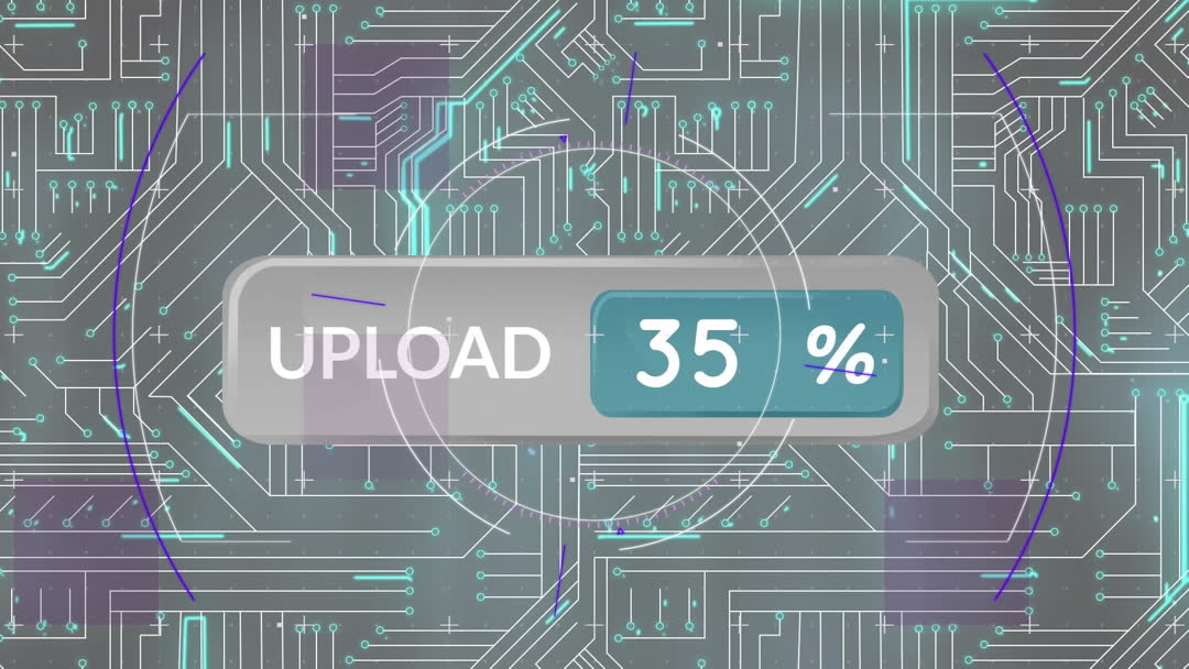 Animation depicts upload progress against futuristic digital circuit background, conveying modern technology and networking concepts. Useful for technology blogs, presentations, seminars on networking efficiency, and user interfaces in software development visuals.