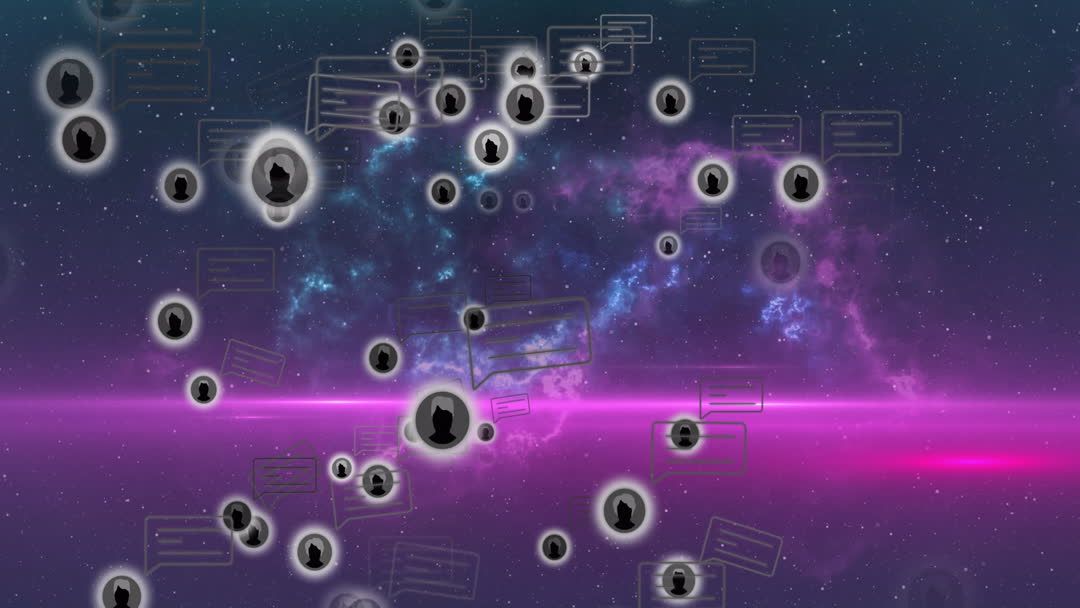 Violet cosmic background symbolizing global digital interaction. User and message icons represent social media communication and connectivity in a technologically advanced society. Useful for projects related to digital networks, social media platforms, online communication strategies, or technology-driven creative visuals.