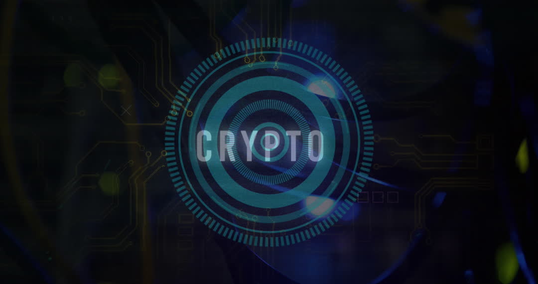 Animated visualization focusing on digital aspects of cryptocurrency and data processing. Blue text in circular scope overlaid on electronic motherboard symbolizes technological advancements in blockchain and cyber security. Perfect for presentations on digital currency, fintech industries, cyber security initiatives, or technological innovations in finance.