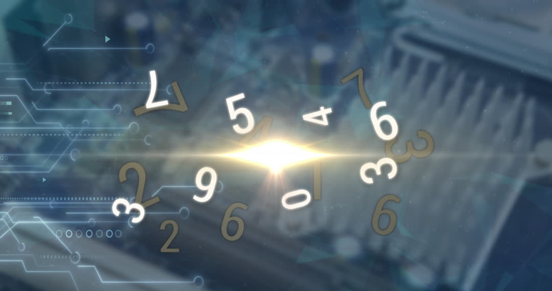 This visualization portrays data processing represented by numbers and circuitry animation set over a computer board. It suggests technological advancements and modern computing solutions. Use it for illustrating digital presentations, technology tutorials, or concept visuals about data systems.