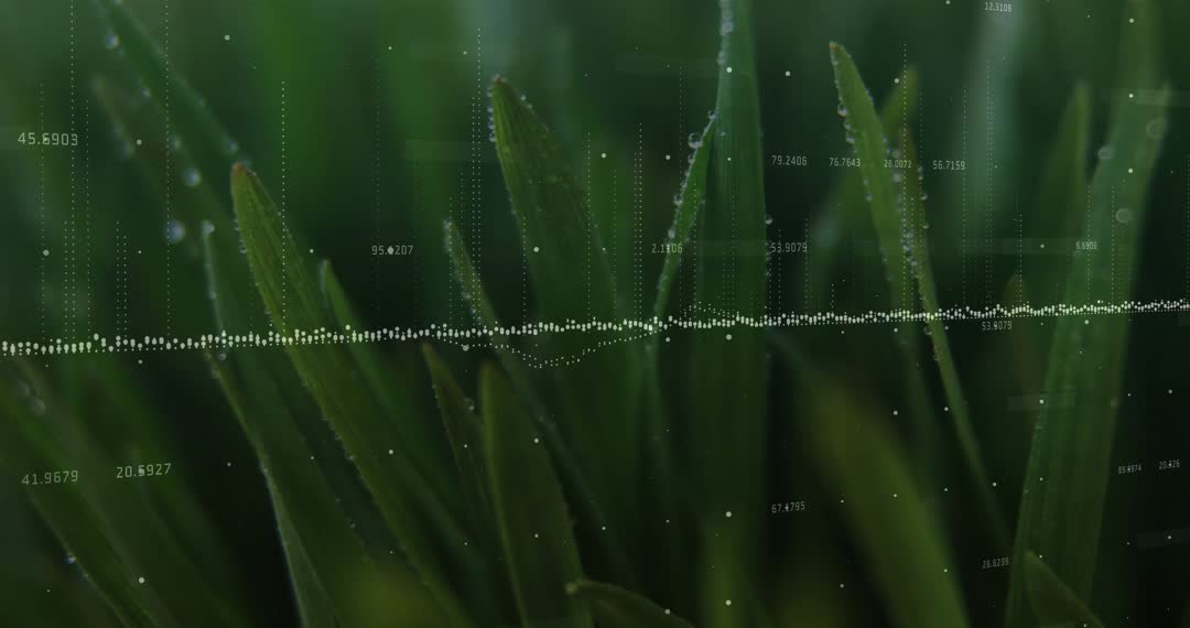 Macro video combining elements of nature with digital tech as waveform overlays dew-covered grass. Serene blend of organic beauty and technology showcasing advancements in digital data collection. Perfect for concepts of nature analysis, waterproof technology, environmental studies, innovative agriculture, and digital art fusion projects.