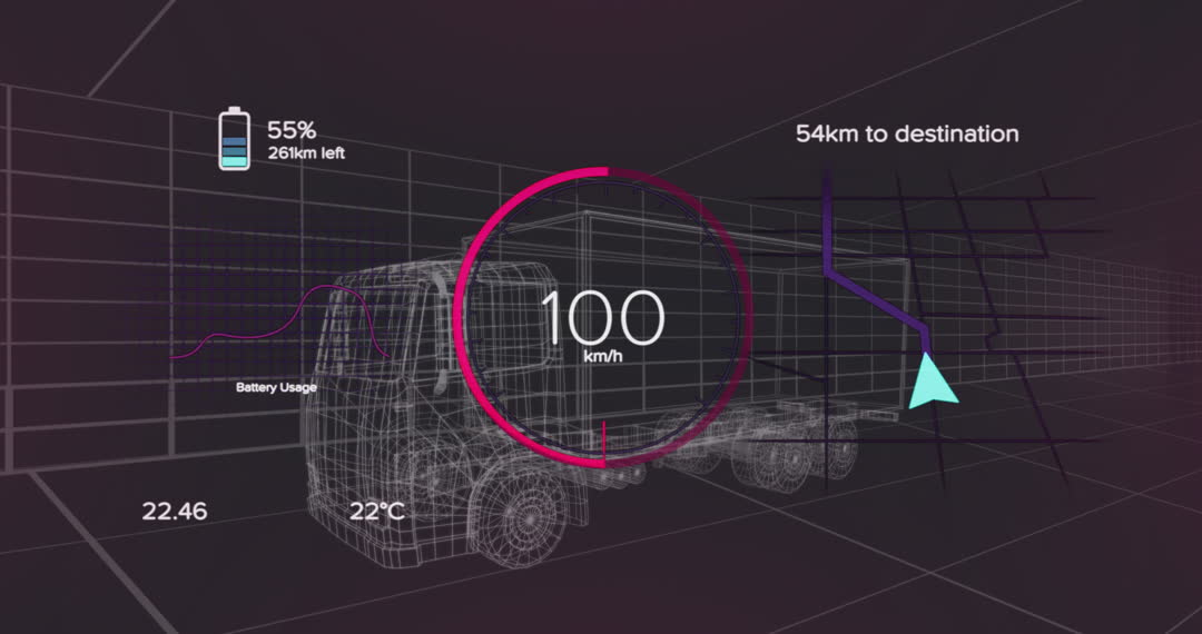 Innovative graphical interface showcasing vehicle data and 3D visualization against dark background. Includes speed, battery usage, temperature, and navigation details. Ideal for use in technology presentations, automotive software demonstrations, and futuristic transport concepts.