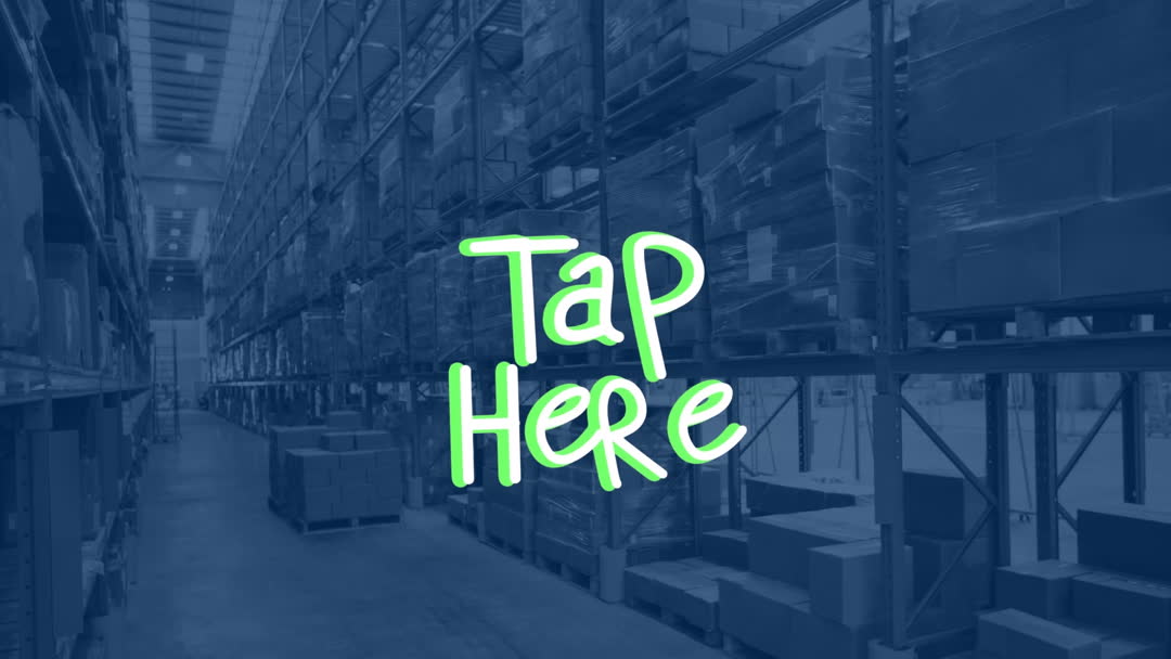 An animated concept showing a 'Tap Here' prompt overlay on a warehouse background. This video blends digital interface elements with a logistical environment, emphasizing the intersection of technology and industrial operations. Ideal for use in presentations or brochures related to smart warehouse systems, e-commerce solutions, shipping innovations, or social media engagement tools within industrial contexts.