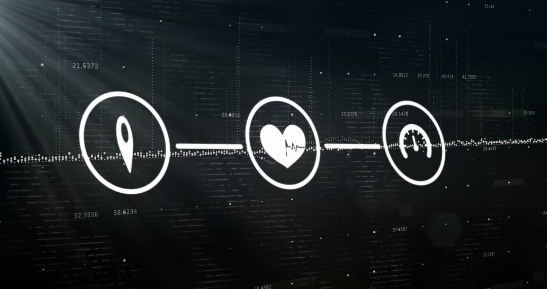 This modern digital animation showcases a series of interconnected icons across an engaging waveform interface. The icons, including a map pin, heartbeat, and gauge symbol, dynamically pulse and move, symbolizing concepts of connection, digital transformation, and data analysis. Ideal for use in presentations related to technology innovations, data storytelling, and analytics deployment. The dynamic flow of the elements emphasizes seamless interaction and real-time information processes.