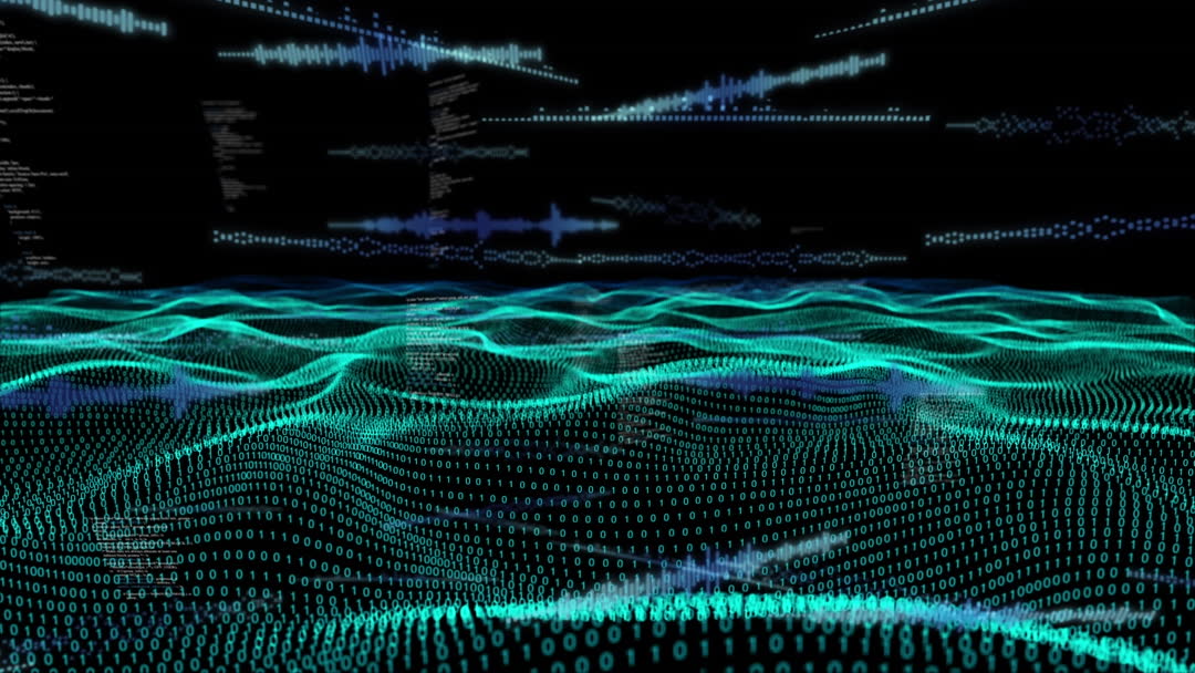 This visualization features digital waves and data processing graphics on a black background, suggesting a concept of intelligence and modern technology. Suitable for use in presentations around data science, programming tutorials, cybersecurity awareness campaigns, or any project promoting futuristic digital solutions.