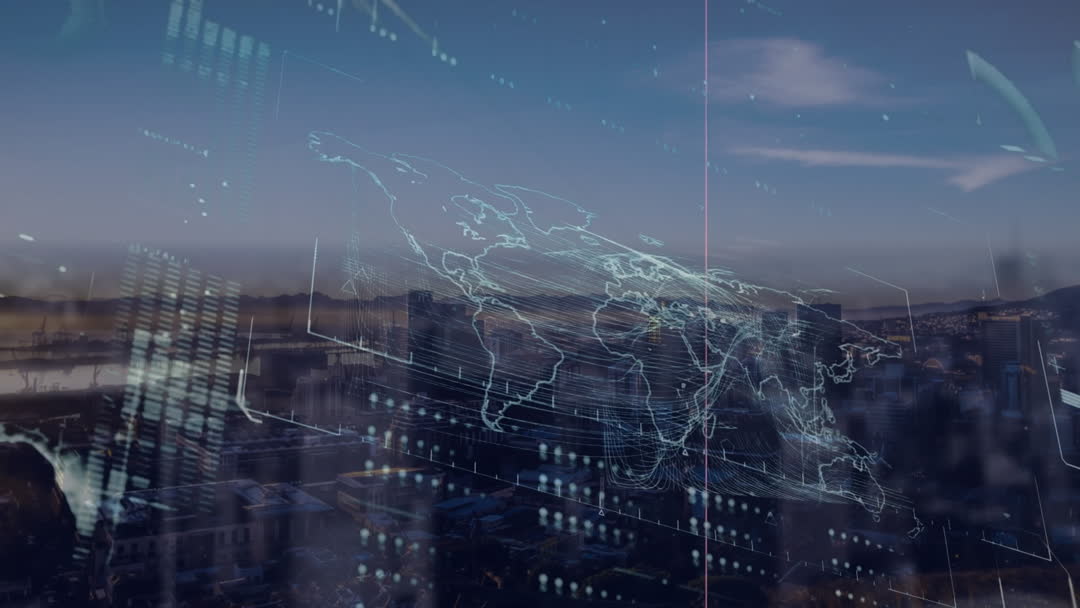 Overlay of animated digital world map onto cityscape symbolizes global connectivity and advanced technology, suitable for illustrating modern computing concepts, global network engagement, and urban technological advancement in marketing materials or presentations.