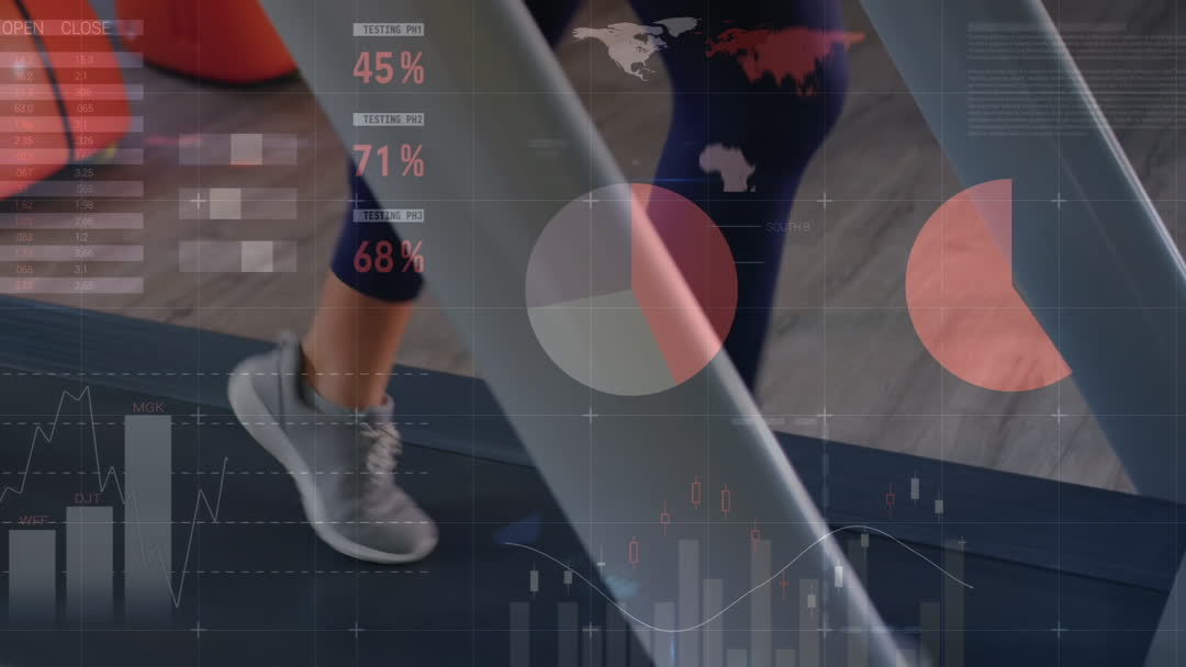 Fusion of digital analytics and fitness displays dynamic tracking in an exercise context. Great for illustrating the integration of technology with sports for web articles or marketing on health and technology advancements.