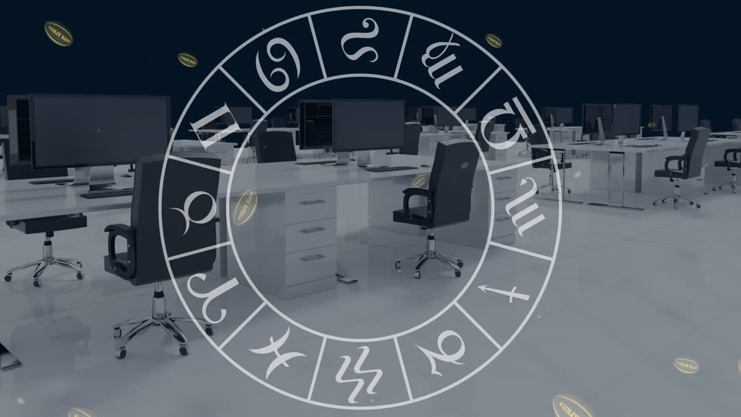 - Digital Zodiac Symbols Overlaying Modern Office Workspace