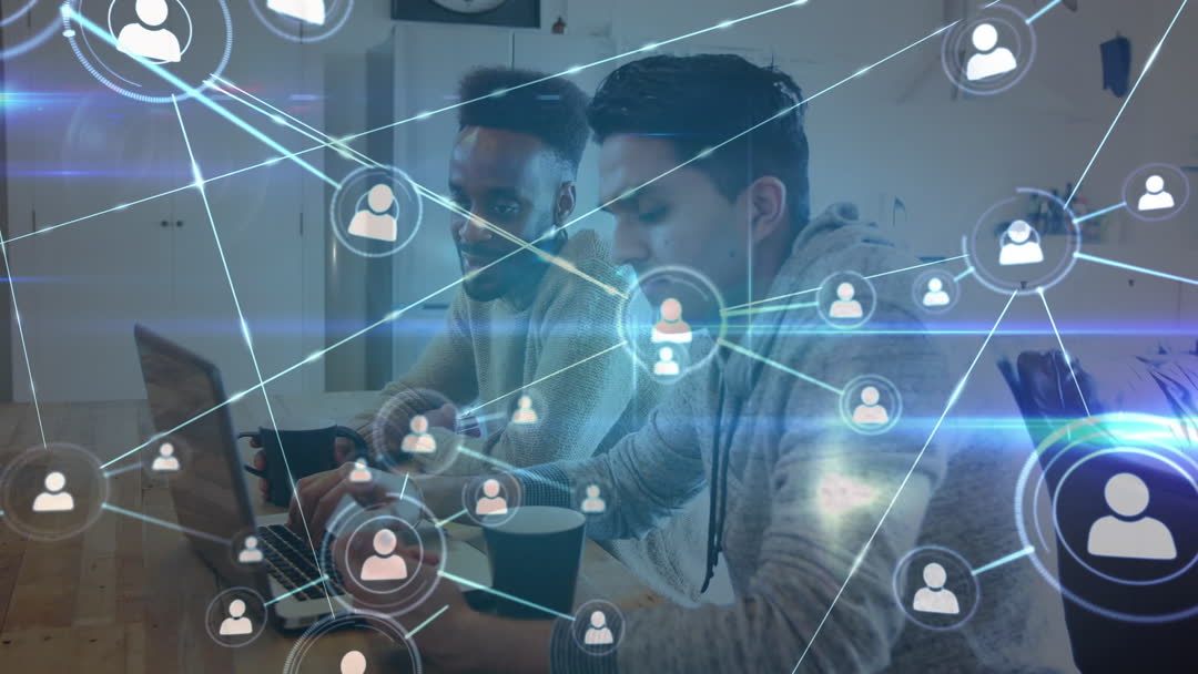 Digital network overlay representing connections as two diverse individuals are using a laptop to analyze data or collaborate on a digital project. Perfect for illustrating themes related to online communication, teamwork, business innovation, collaborative technology solutions, global connectivity, or remote work initiatives.