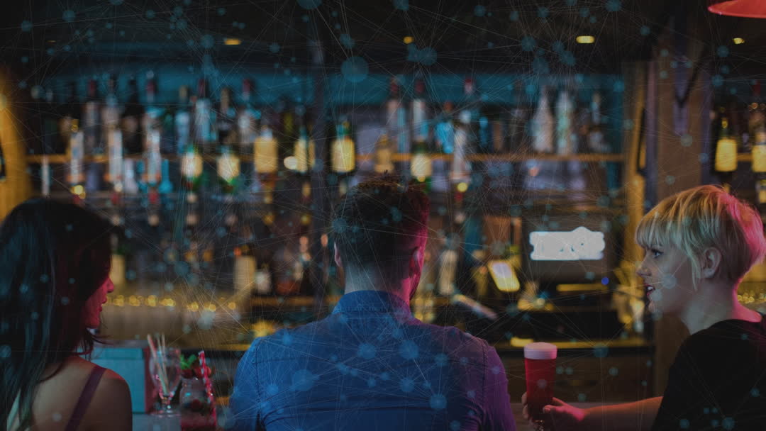 Friends interacting in trendy bar with digital network graphics, symbolizing modern connectivity and the intersection of social environments with technology. Useful for illustrating the impact of technology on social interactions, content related to nightlife, tech in social settings, and lifestyle blogs or articles.