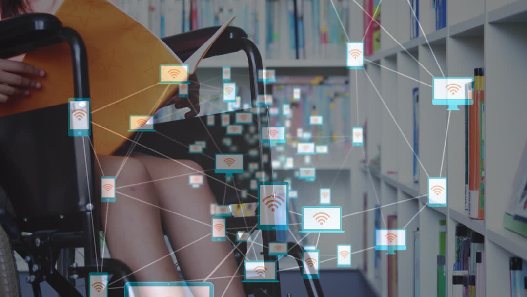 Young girl in wheelchair engaging with digital learning resources in library filled with books. Network icons suggest connectivity and integration of educational technology. Concepts include equal access to information, innovative learning environments, and support for students with disabilities. Ideal for campaigns promoting inclusive education, digital learning tools, and empowerment through technology.