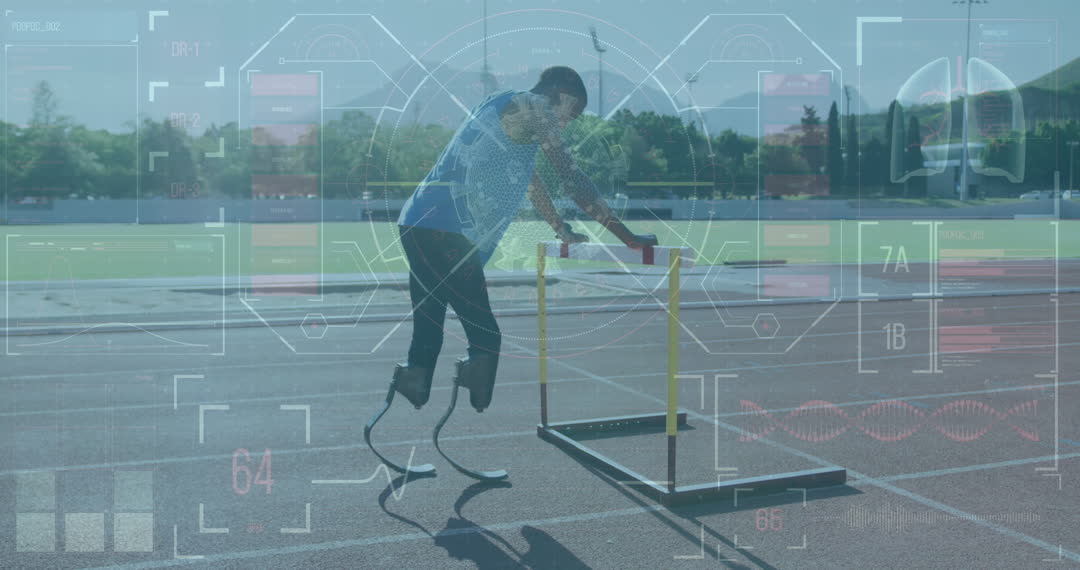 Depicting a disabled African American male athlete with prosthetic legs engaging in hurdles on a track, this video blends sport with digital science fiction through an overlay of futuristic data visuals. Ideal for illustrating topics of modern sports technology, athletic resilience, or advancements in rehabilitative science, it also serves educational or motivational contexts related to overcoming barriers.