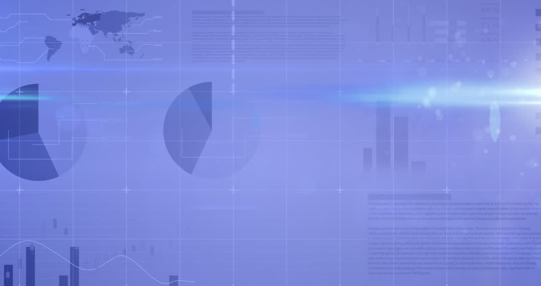 Abstract animation depicts data processing with light spots over a blue background. Featuring global elements like maps, charts, and graphs, it evokes themes of business and technology. Useful as a backdrop for presentations, technology ads, or financial blogs to convey innovation and progress.
